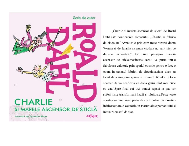 In cazul in care nu gasiti referatul rezumat charlie si marele ascensor de sticla va rugam sa efectuati o cautare dupa un singur cuvant cheie. După ce au plecat din casa lui charlie bunicii părinţii dar şi copilul împreună cu domnul willy wonka au urcat în ascensorul de sticlă care i a înălţat tot mai sus spre nori. Charlie și marele ascensor de sticlă de roald dahl cu ilustrații de quentin blake traducere din limba engleză de christina anghelina editura arthur categorie de vârstă 7 12 ani. Ai libertatea sa platesti in rate beneficiezi de promotiile zilei deschiderea coletului la livrare easybox retur gratuit in 30 de zile si instant money back.