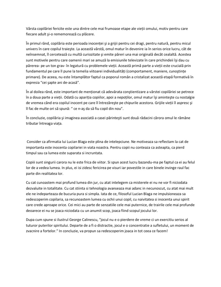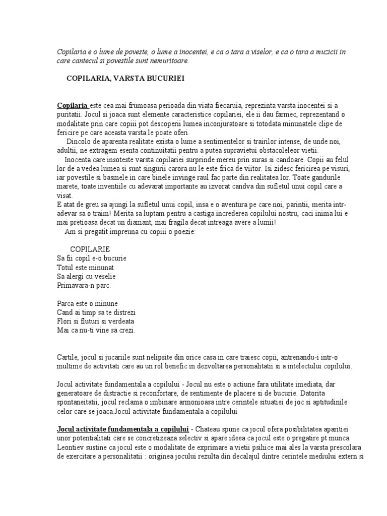 Copilul nu constientizeaza raul el doar se joaca glumeste este pus pe nazbatii si pozne. O compunere despre copilărie despre cea mai frumoasă perioadă din viața unui copil. Joaca este foarte importanta pentru dezvoltarea sociala emotionala cognitiva si fizica a copilariei. Hai mai bine despre copilarie sa vorbim caci ea singura este vesela si nevinovata.