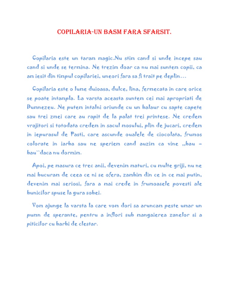 Aici copiilor li se citește mereu pe fețe veselia iar grijile îi ocolesc cu încăpățânare. 1 daca iti poti purta copilaria cu tine nu devii niciodata batran. în acest tărâm al fanteziei buzele. C ar fi bine sa am mai multa incredere in mine.