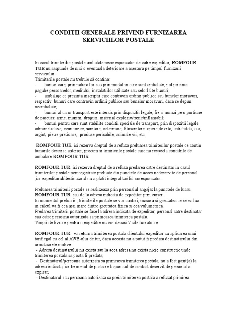 Conditii Generale Privind Furnizarea Serviciilor Postale