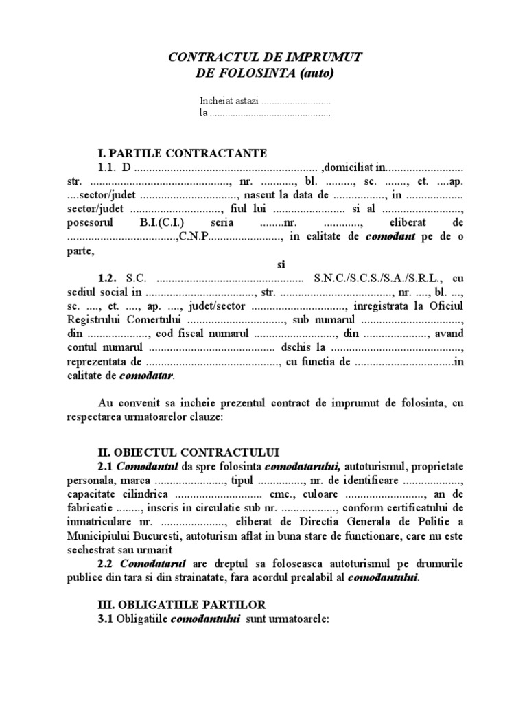 Contract de imprumut de folosinta comodat autovehicul. Partîle au convenit sa încheie prezentul contract de împrumut de folosinta pe o. 7 2 votes acasă. Prezentul contract înceteazã de plin drept fãrã a mai fi necesarã interventia unui tribunal arbitrar unei instante judecãtoresti în cazul în care una dintre pãrti.