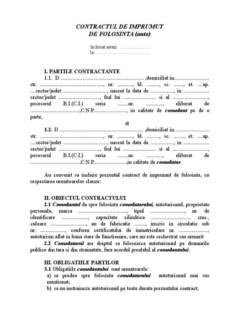 Contract de imprumut de folosinta auto. Este un model de contract utilizat pentru imprumut de folosinta autoturism. Predarea locuinţei va avea loc la data de dată la care începe executarea contractului a cărui durată se încheie până la data de. în urmă cu 4 zile 20 ore. In ce priveste bunurile acestea trebuie sa fie nefungibile bunuri determinate prin caractere individuale care nu sunt susceptibile de a fi inlocuite cu alte bunuri in executarea unei obligatii si.