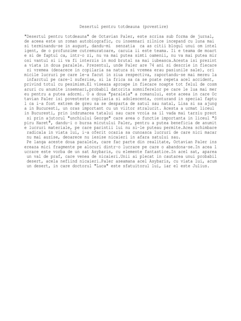 Desertul pentru totdeauna rezumat. Desertul pentru totdeauna merita citita mai ales de cei care au o slabiciune pentru octavian paler in special pentru pasajele autobiografice iar cartea primeste doar trei stele din cauza faptului ca substanta care se regaseste de obicei in randurile lui paler este pe alocuri diluata. O astfel de carte este si cartea lui octavian paler deşertul pentru totdeauna o carte duioasa plina de amintiri calde sau reci ravasitoare si incantatoare. Desertul pentru totdeauna povestire desertul pentru totdeauna de octavian paler este scrisa sub forma de jurnal de aceea este un roman autobiografic cu insemnari zilnice incepand cu luna mai si terminandu se in august dandu mi senzatia ca as citii blogul unui om intel igent de o profunzime cutremuratoare caruia ii este teama. Rezumat deșertul pentru totdeauna este o operă cu puternic caracter autobiografic scrisă de octavian paler și publicat pentru prima dată în anul 2002.