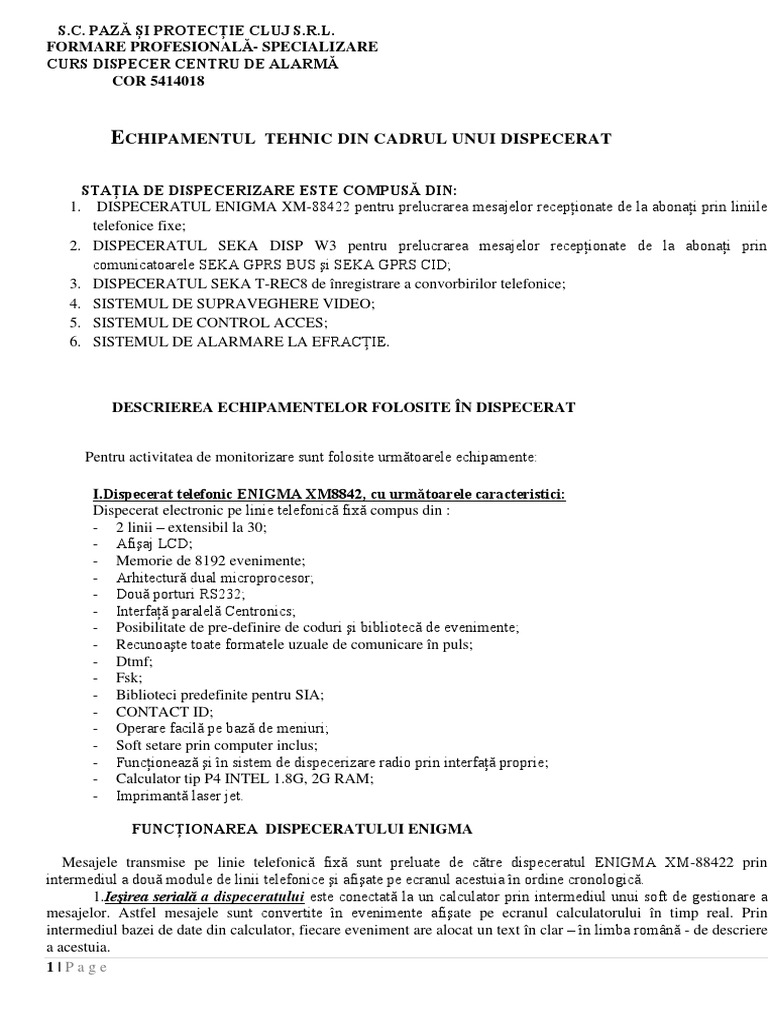 Pregătire practică activităţi practice în dispecerat. Atestat dispecer centru de alarma. Utilizarea unor platforme software dedicate managementului securitatii. Acest post este de o insemnatate deosebita deoarece reprezinta firma atat in relatia cu beneficiarii cat si in relatii cu colegii din teren echipajele de interventie.
