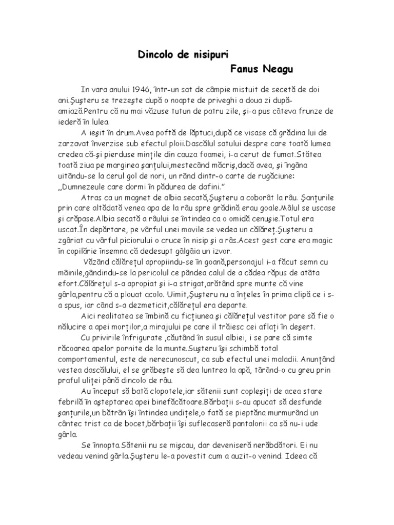 Fanus neagu dincolo de nisipuri rezumat. Dincolo de nisipuri este o nuvelă scrisă de fănuș neagu și publicată pentru prima dată în volumul intitulat cantonul părăsit apărut în anul 1964. Dincolo de nisipuri de fanus neagu rezumat personajul principal este uteru care se trezise trziu cci sttuse la priveghit i observa c familia era plecata prin sat dupa mancare. Dincolo de nisipuri de fanus neagu rezumat referate rezumate dincolo de nisipuri de fanus neagu rezumat intr o dupa amiaza din vara secetosului an 1946 un taran dintr un sat de campie buzoian pe nume susteru iese din casa manat de pofta unei tigari. Isi rasuceste o tigara din frunze uscate de iedera si porneste pe ulita prafuita spre buzau.