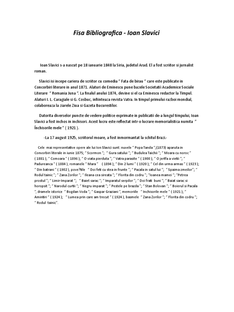 Fisa biografica ioan slavici. Romanul infatiseaza un conflict de rase si credinte intr un mediu de convietuire a romanilor si ermanilor cu deznodamant tragic. Nuvele precum mo. 17 august 1925 la crucea de jos în apropiere de panciu județul vrancea a fost un scriitor și jurnalist român. Alongside eminescu he founded the young romania social and literary academic society and organized in 1871 the putna celebration of the romanian students from romania and from abroad.