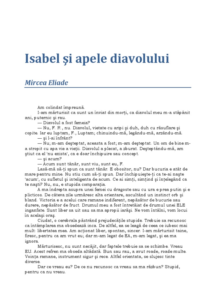 Infernul e sus așa cum știți. Paperback published in paperback published in hardcover published in 1 quote from isabel și apele diavolului. Cartea isabel si apele diavolului mircea eliade in format pdf isabel și apele diavolului ilustrează continua tensiune a spiritului lui eliade între magic și mistic între voință și har între autorealizarea eului și pierderea de sine în dumnezeu vizibilă și în foiletoanele pe care le trimitea cuvântului în ciuda faptului că itinerariul spiritual 1927 părea să fi. Eroul cartii este un doctor in arta extrem orientala ce parasise tara sa de miazanoapte pentru a si continua cercetarile in india.