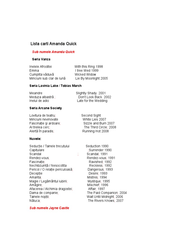 2 thoughts to carti de amanda quick lista completa jojo spune. Acasa carti liste cu carti lista carti amanda scott. Amanda quick e una din scriitoarele mele preferate dar nu stiam ca a scris atatea carti e kilometrica lista. Seria magia craciunului 5 carti romantice 100 lei.