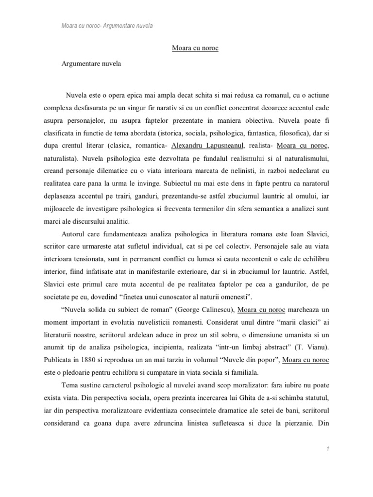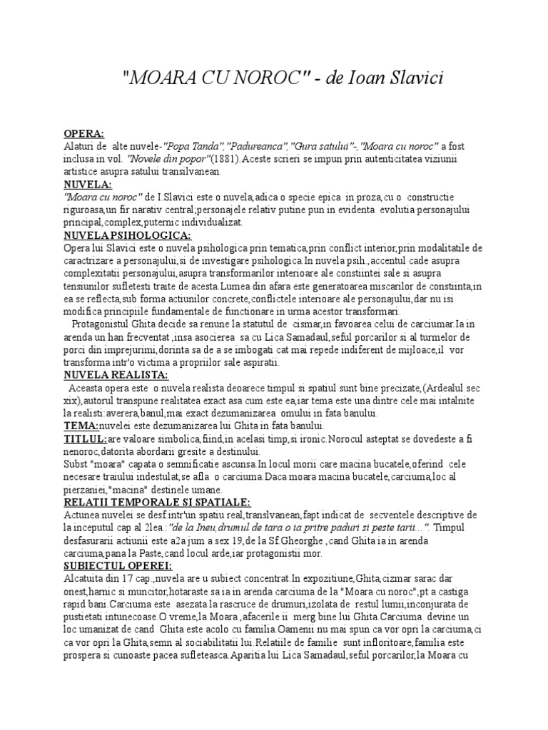 Are un singur fir narativ instrainarea lui ghita de familie prin complicitatea la faradelegile lui lica un numar mediu de personaje ana ghita soacra lica porcarii lui raut saila buza rupta pintea accentul punandu se pe complexitatea de. Opera literara moara cu noroc de ioan slavici este o nuvela psihologica deoarece are toate trasaturile aceste specii literare. Moara cu noroc de ioan slavici nuvela psihologica nuvela este specia epica in proza cu actiune mai ampla decat a povestirii conflict consistent si personaje puternic individualizate. Moara cu noroc este o nuvela psihologica deoarece inregistreaza modificarile psihologiei personajelor principale si permite cititorului sa patrunda in interiorul mecanismului prin care se construiesc rationamentele si reactiile acestora.