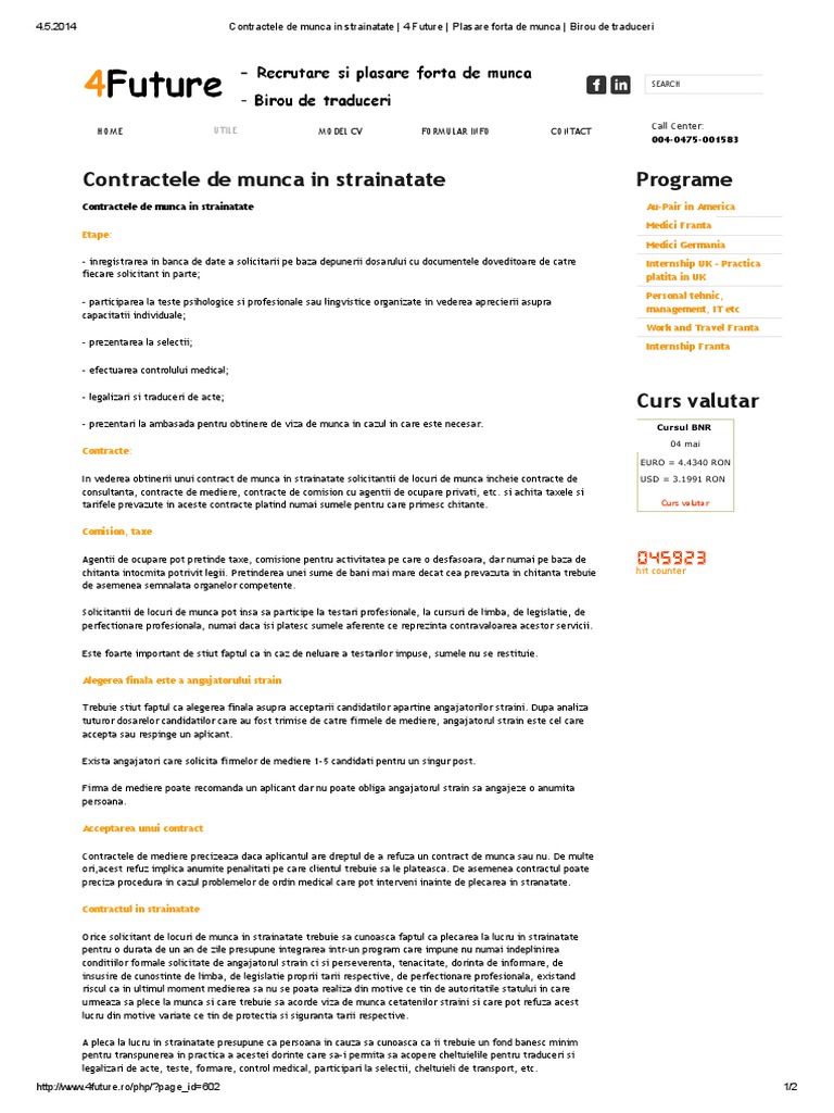 Succesul nostru este dat de potrivirea cat mai exacta a profilelor profesionale ale candidatilor consiliati. Mai mult ministerul muncii și mae vor avea o situație exactă a românilor care muncesc în alte țări pe baza datelor transmise trimestrial de firmele care au intermediat găsirea joburilor. Inspectia muncii a publicat pe site ul oficial un avertisment privind munca in strainatate prin intermediul agentilor de plasare a fortei de munca. Conform prevederilor legii nr 156 2000 privind protectia cetatenilor romani care lucreaza in strainatate republicata cu modificarile si completarile ulterioare activitatea de plasare forta de munca in strainatate o poate desfasura un agent de plasare a fortei de munca persoana juridica.