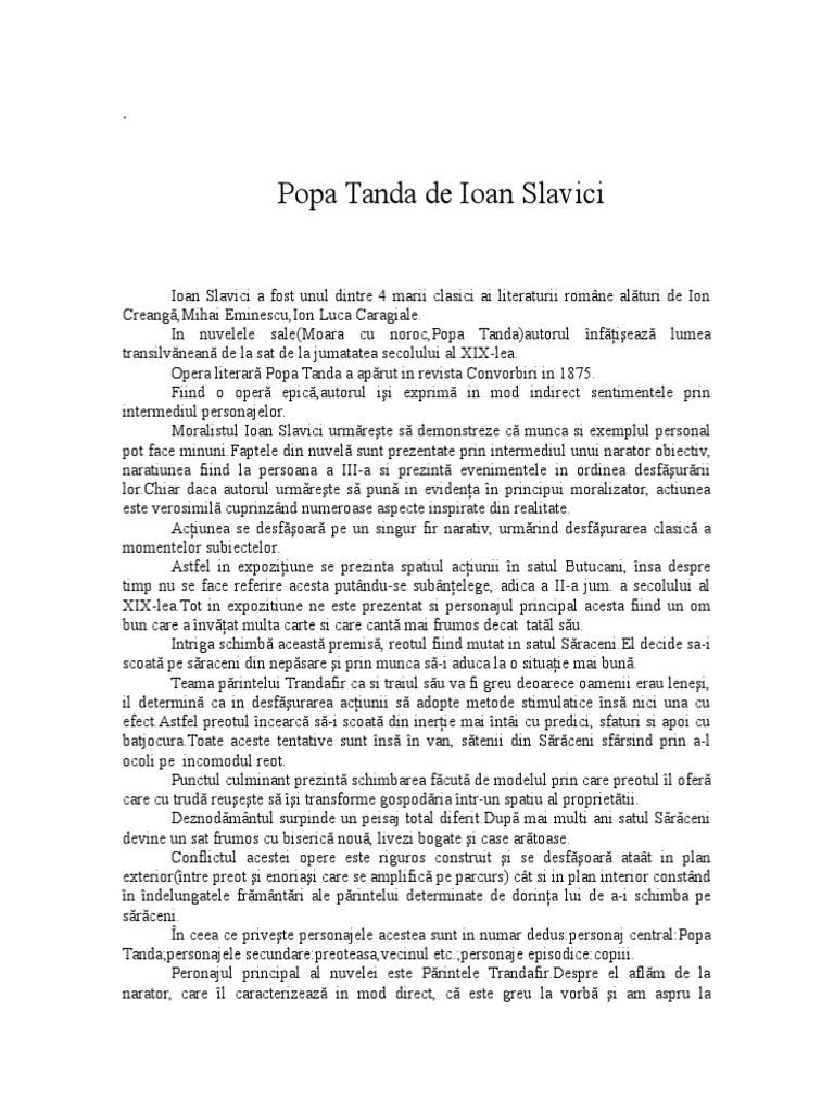 închideți și începeți să tastați. Popa tanda este o nuvela scrisa de ioan slavici care elogiaza puterea actiunii capabile sa transforme o întreaga comunitate. Era dascal in butucani bun sat si mare oameni cu stare si socoteala. Mai ales dacã era cam rãguşit le bea cu gãlbenuş de ou şi i se dregea organul încât rãsunau ferestrele când cânta mântuieşte doamne norodul tãu.