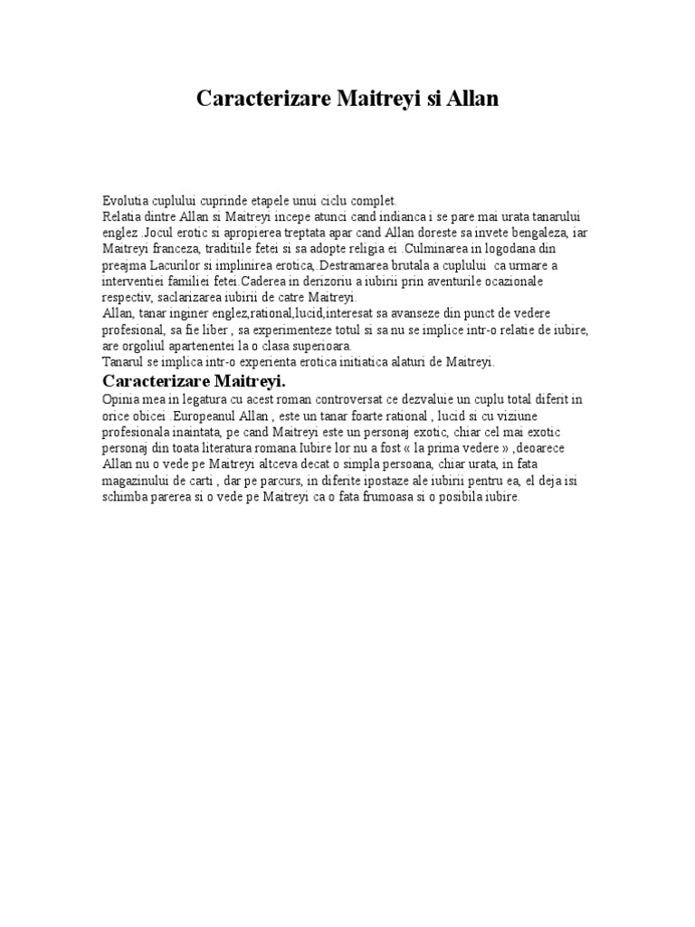 Cei doi protagonisti allan inginer englez venitsa proiecteze sistemul unei delte si maitreyi tanara poeta hindusa isi traiesc iubirea ca pe oexperienta extatica insa cultura ii determina sa o abandoneze intensitatea relatiei dintre cei doi reprezentanti ai unor culturi foarte diferite creste odata cudragostea lor pentru allan avand insa. Puteti gasi foarte multe referate accesand categoriile din partea dreapta despre relatia dintre maitreyi si allan. Comentariu relatia de dragoste dintre maitreyi si allan. Maitreyi si filozoful tagore.