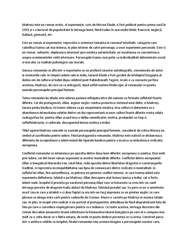 Aparut in 1933 romanul lui mircea eliade are ca tema o poveste de iubire trista si impresionanta petrecuta in spatial misterios si exotic al indiei si este alcatuit din 15 capitole numerotate cu cifre fara titluri. Interesant sunt de analizat percepțiile lui allan despre maitreyi. Formula estetica folosita este moderna romanul fiind alcatuit ca o lunga marturisire pe marginea jurnalului scris de narrator cu ceva timp in urma pe cand se afla la india maitreyi are prin urmare character confesiv cel care vorbeste fiind si. Romanul infatiseaza iubirea imposibila dintre doi tineri allan un inginer englez venit in india sa lucreze in constructia de cai ferate si maitreyi fiica aristocratului indian narendra sen sef al lui allan evolutia cuplului este ascendenta in functie de comportamentul celor doi intelectual afectiv si volitiv fiecare mostenind un anumit factor civilizator.