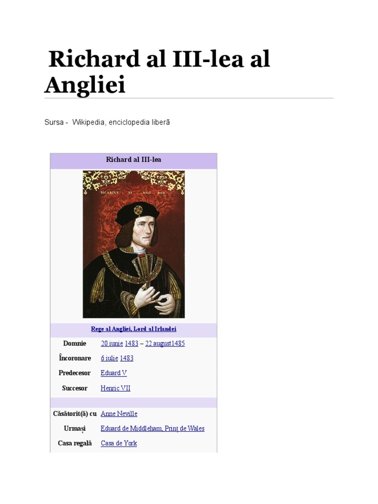 Erau veri primari și tovarăși de joacă în copilărie și au fost admiși împreună în. A fost ultimul rege din casa de york și înfrângerea lui în bătălia de la bosworth a fost punctul culminant al războiului celor două roze și sfârșitul dinastiei plantagenet. De la henric al iii lea până la george al iii lea nici un alt monarh englez n a avut o domnie atât de lungă. A fost un gospodar foarte bun al nordului angliei și a respins atacurile scoțienilor interesant este că sicriul a fost fabricat de michael ibsen unul dintre descendenții monarhului al cărui adn a permis identificarea scheletului.