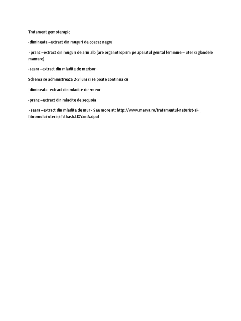 Tratamente naturiste folosite in diverse forme fie ca infuzie macerate sau pulbere pot diminua fibromul ameliorand congestia pelviana si regland cantitatea de hormoni din organism. Majoritatea pacientelor cu fibrom uterin prezinta simptome usoare sau sunt asimptomatice si nu vor avea nevoie niciodata de tratament. In continuare va oferim o schema detaliata de tratament natural pentru fibromul uterin. Extract din muguri de arin alb muguri de coacaz negru dupa o schema stabilita de medicul apifitoterapeut urmata timp de 3 luni.
