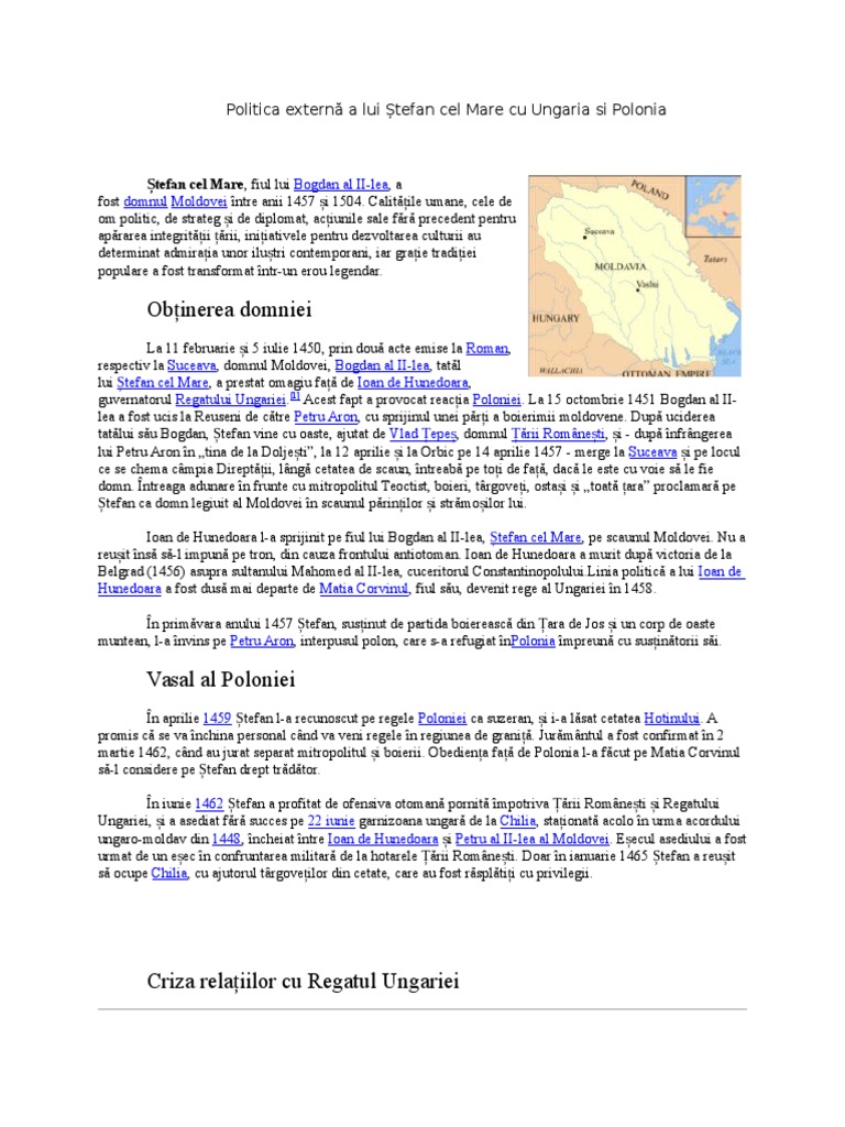 Stefan cel mare politica externa. De dimensiunea unui ducat moldova din timpul lui ştefan cel mare a beneficiat de una dintre cele mai bune administraţii. 2 iulie 1504 suceava supranumit ștefan cel mare sau după canonizarea sa de către biserica ortodoxă română ștefan cel mare și sfânt a fost domnul moldovei între anii 1457 și 1504 a fost fiul lui bogdan al ii lea domnind timp de 47 de ani cea mai lungă domnie din epoca medievală din țările române. După urmărirea lui petru aron care se refugiase în polonia ștefan cade la înțelegere cu regele cazimir restituindu i se cetatea hotinului ceea ce atrage dușmănia regelui ungariei matei corvin. La overchelauţi la 4 aprilie 1459 este recunoscut domn de regele polonez în sensul acceptării suzeranităţii acestei ţări şi cedării hotinului temporar petru aron este izgonit.