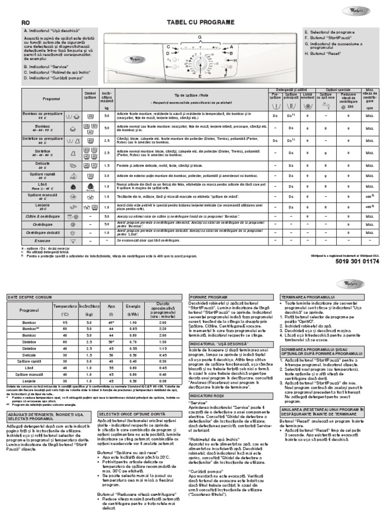 Tabel cu programe whirlpool. Selectorul de programe b. Simboluri programe si functii masina de spalat rufe. Rezultatul este eliminarea apei la o viteza redusa de stoarcere cea mai buna din clasa insemnand mai putine vibratii si mai putin zgomot precum si o eficienta si fiabilitate mai mari. Ro tabel cu programe programul simbol spãlare incãr cãtura maximã kg tip de spãlare note respectaþi recomandãrile producãtorului de pe etichetã detergenþii şi aditivii opþiuni speciale viteza de centrifug.