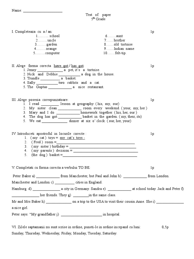 Test engleza clasa 6. Poti alege de asemenea cursuri de engleza intensive de vara cu program de o ora si jumatate de 3 5. Test de evaluare iniţială anul şcolar 2013 2014 disciplina limba engleză clasa a vi a l1 învăţământ gimnazial limbi moderne teste clasa a 6 a. Vizualizaţi 0 review uri 48 descărcări. In continuare veti gasi si legaturi catre pagini cu teste si exercitii de nivel mediu si mai avansat.