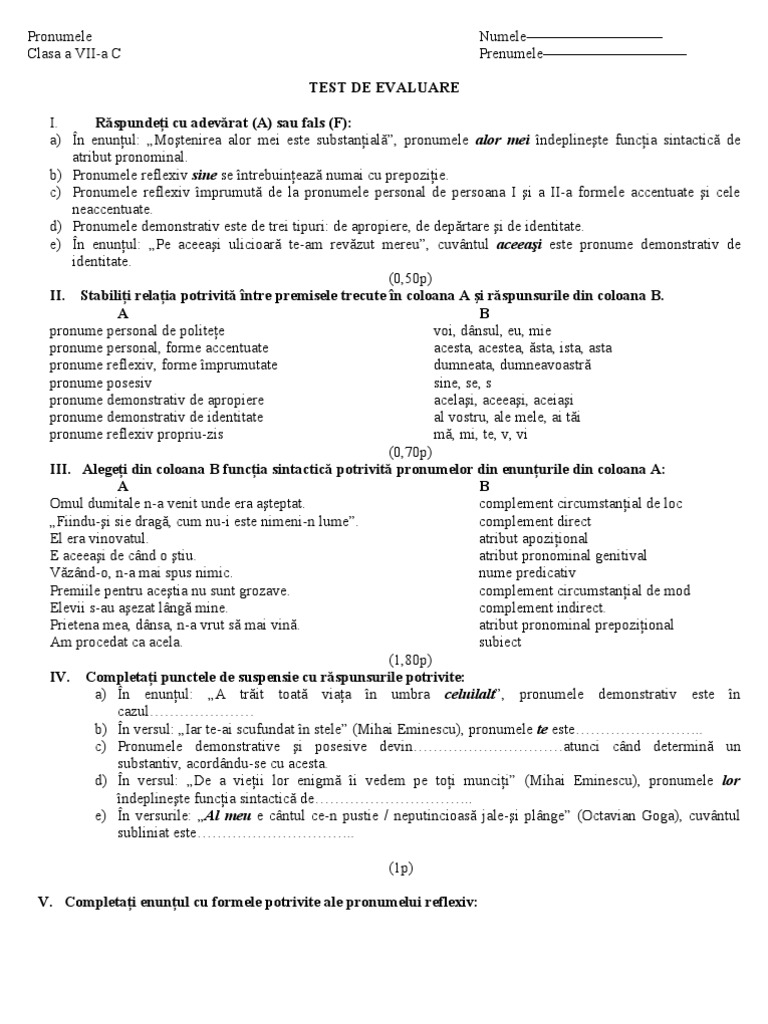 Test pronumele personal reflexiv posesiv demonstrativ învăţământ gimnazial limba şi literatura român ă.