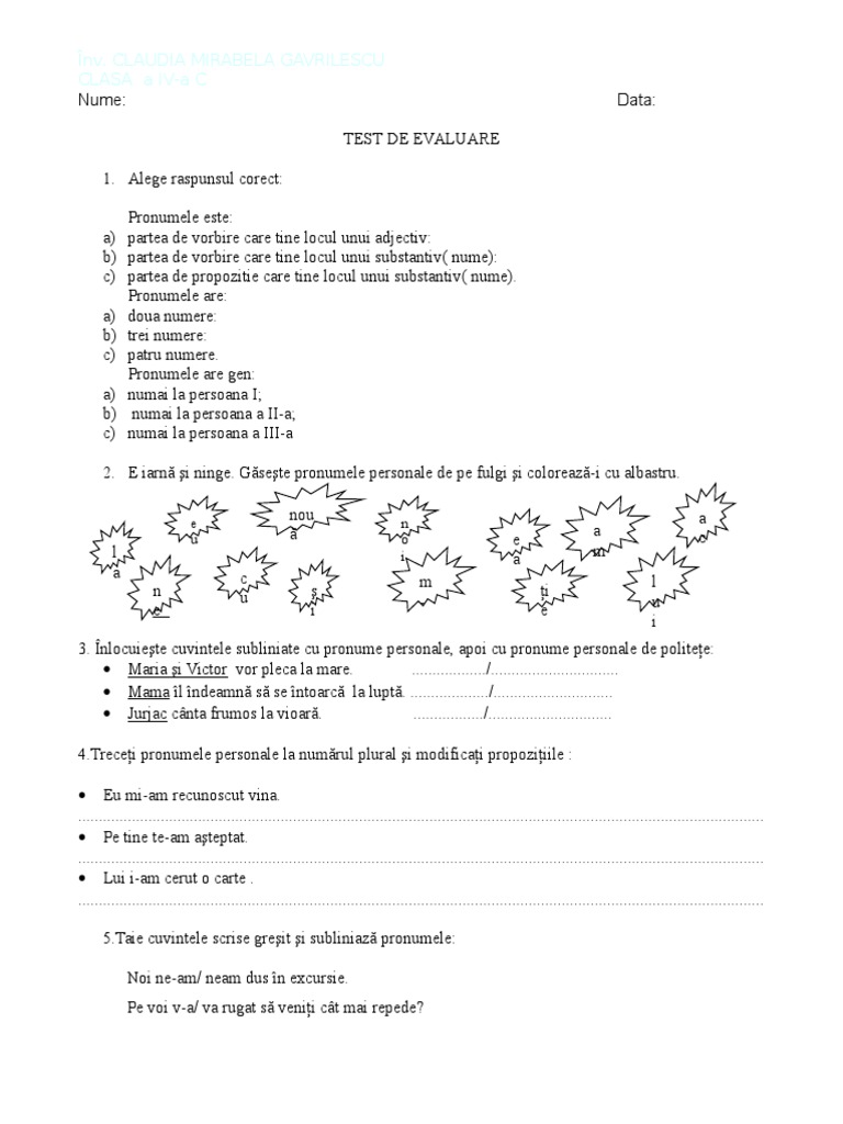 Test pronume clasa 6. Plural gen feminin caz ac complement circumstanțial de loc. Erau un fel de pantaloni de care are nevoie oricine. Acest material îți poate fi util ca elev în clasa a vii a sau a viii a ori ca profesor ca material auxiliar. Precizeazd modul verbelor din fragmentul.