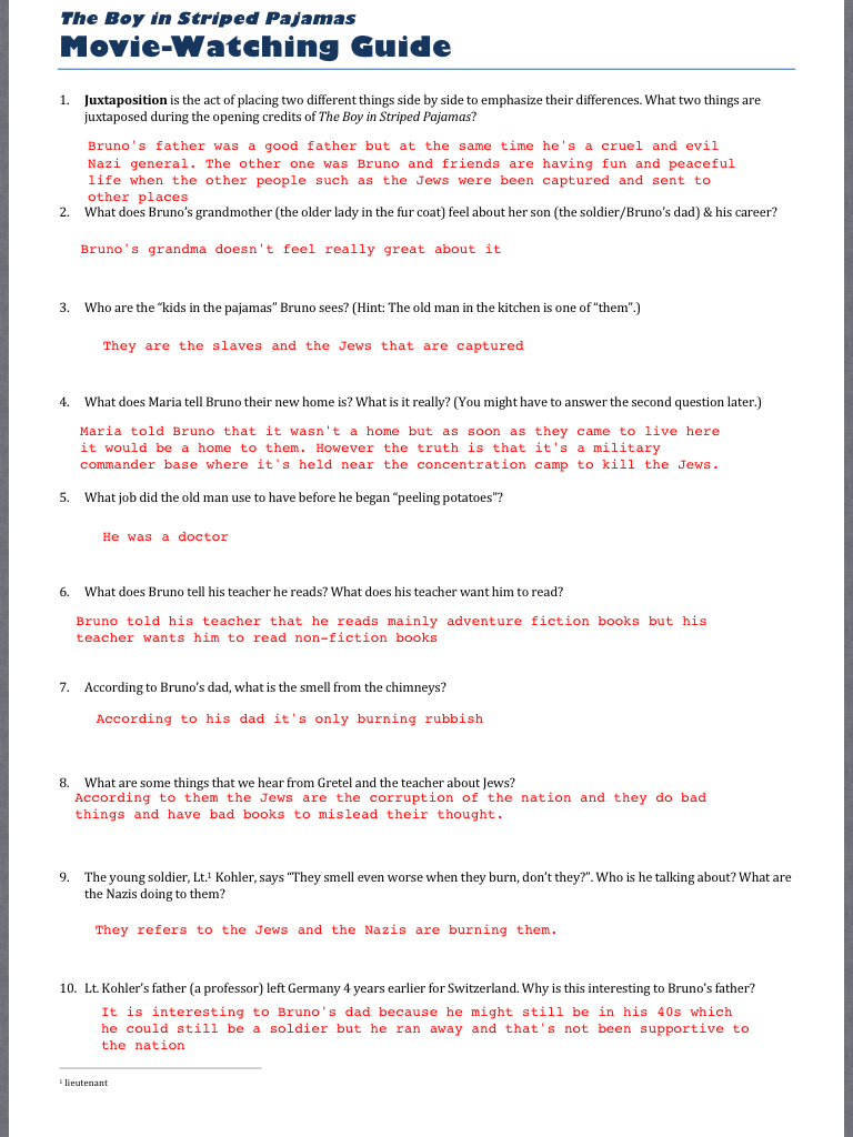 The boy in the striped pajamas movie questions. This is a list of 42 questions that go in order with the film the boy in striped pajamas. 3rd 8th grade. The questions are designed to ensure that students are paying attention to and comprehending the film. The boy in the striped pajamas questions and answers the question and answer sections of our study guides are a great resource to ask questions find answers and discuss literature.