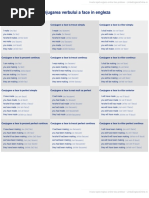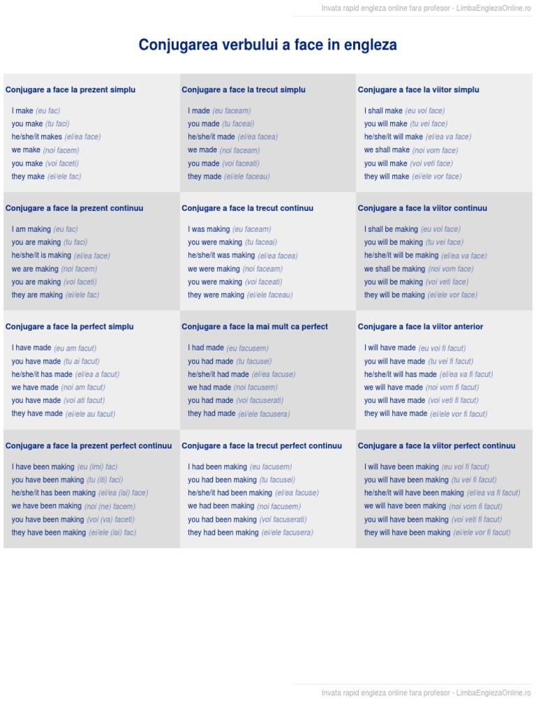 Conjugarea verbului a face la trecut simplu. In engleza moderna verbul a avea este printre cele mai utilizate verbe ajutand la formarea timpurilor perfecte. Conjugarea verbului a face la toate timpurile verb conjugation to make in all tenses. Conjugarea verbului a avea la viitor simplu.