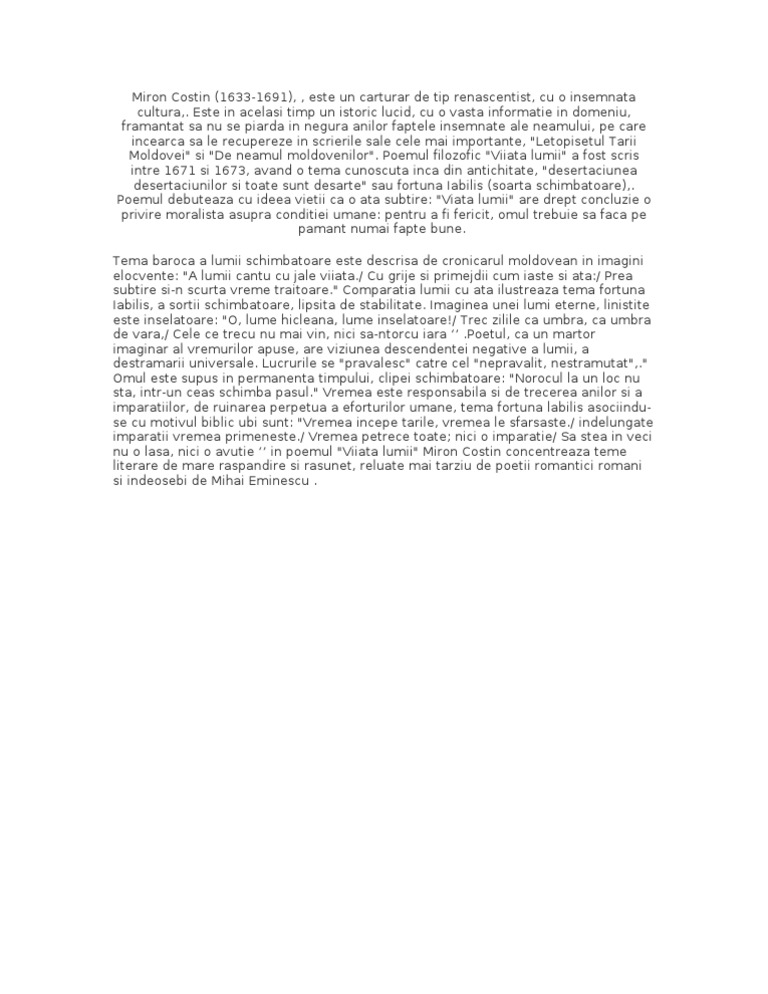 Academia edu is a platform for academics to share research papers. Miron costin nu era însa numai un om politic cu înalte demnitati în statul acela de tip medieval ci si un ilustru intelectual al vremii. A lumii cântu cu jale cumplită viiața cu griji și primejdii cum iaste și ața. Viața lumii de miron costin 0 versuri.